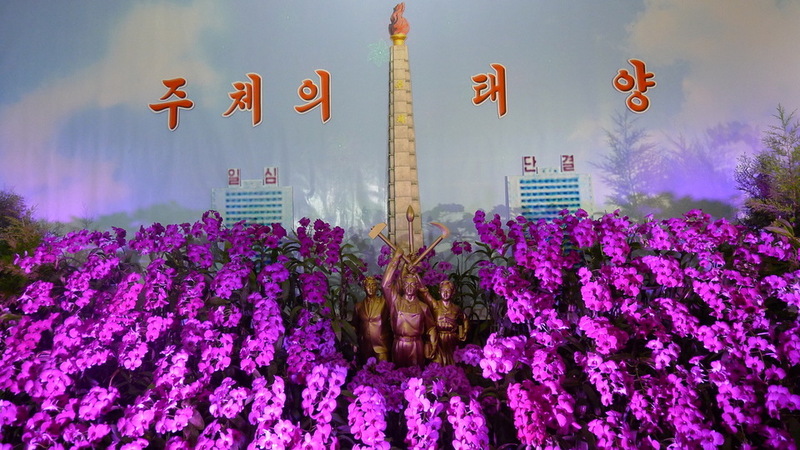 At the Flower Festival that takes place at the Okryu Exhibition Hall several flower installations are on display, often presented by companies, and these installations are either representative of their trade (such as an exhibit featuring a tour bus for a travel company) or are a model of the Mangyongdae Native House.