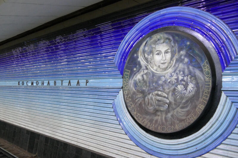 Spot Yuri Garagin and Valentina Tereshkova, the first woman in space (1963), then head above ground to see the statue of Vladimir Dzhanibekov, the Uzbek-Russian cosmonaut who spent almost five months in orbit in the 1980s.