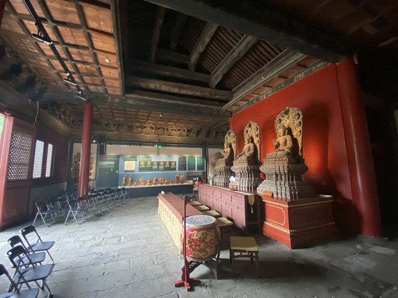 The north building here is the Zhihua Hall, where the musical performances take place. The exhibit in this hall is dedicated to jing music, and the monks who perform this devotional art form. It’s interesting and clear, although it would be nice if they played some of through speakers for those of us who carelessly miss the daily concerts. There are also large buddha statues in the middle and behind the main section of the building. The once-ornate ceiling is on display in the Philadelphia Museum of Art, having been sold some time in the past.